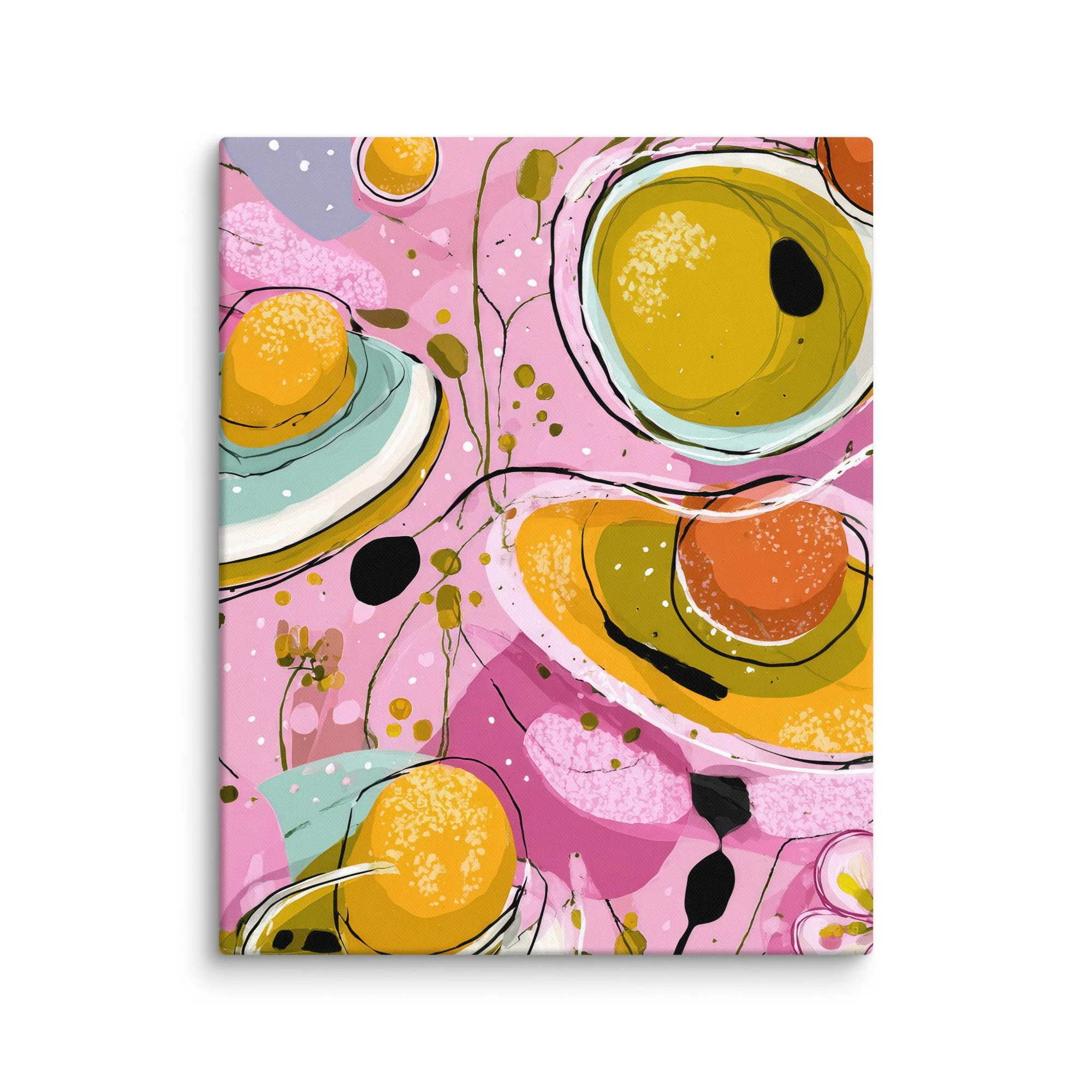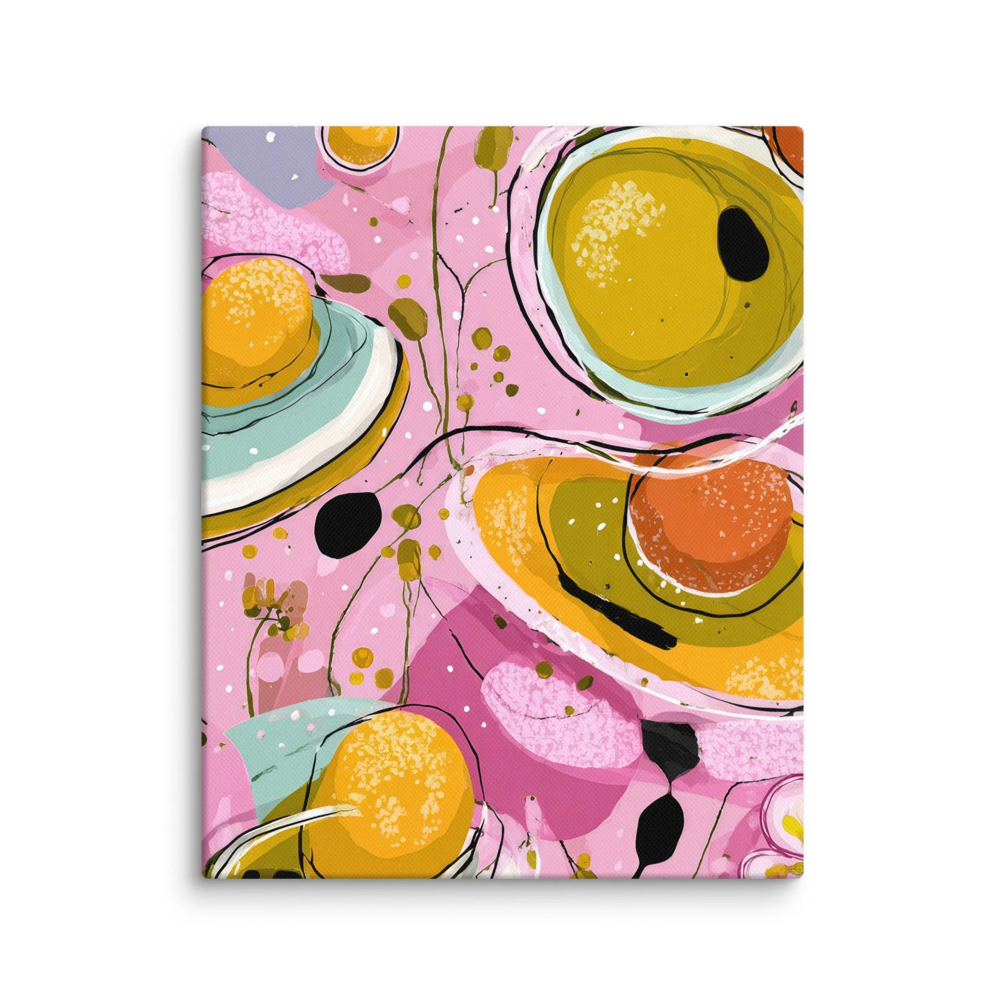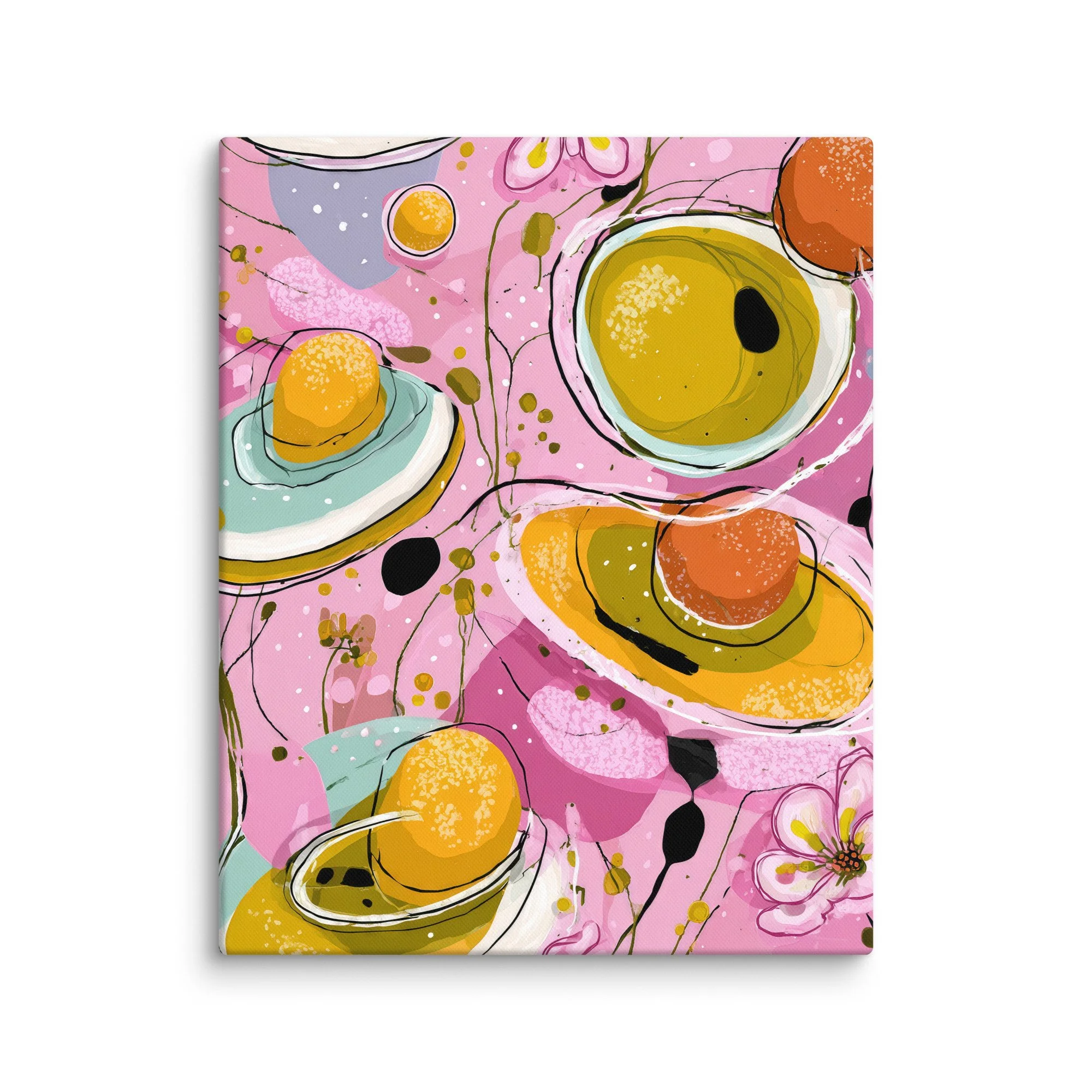 Immerse your space in a universe of joy and energy with this abstract wall art. Swirling golden orbs and citrus-toned rings orbit through a pink dreamscape, accented by delicate hand-drawn blossoms and painterly splashes. The composition feels both galactic and organic — a balance between cosmic mystery and floral grace.