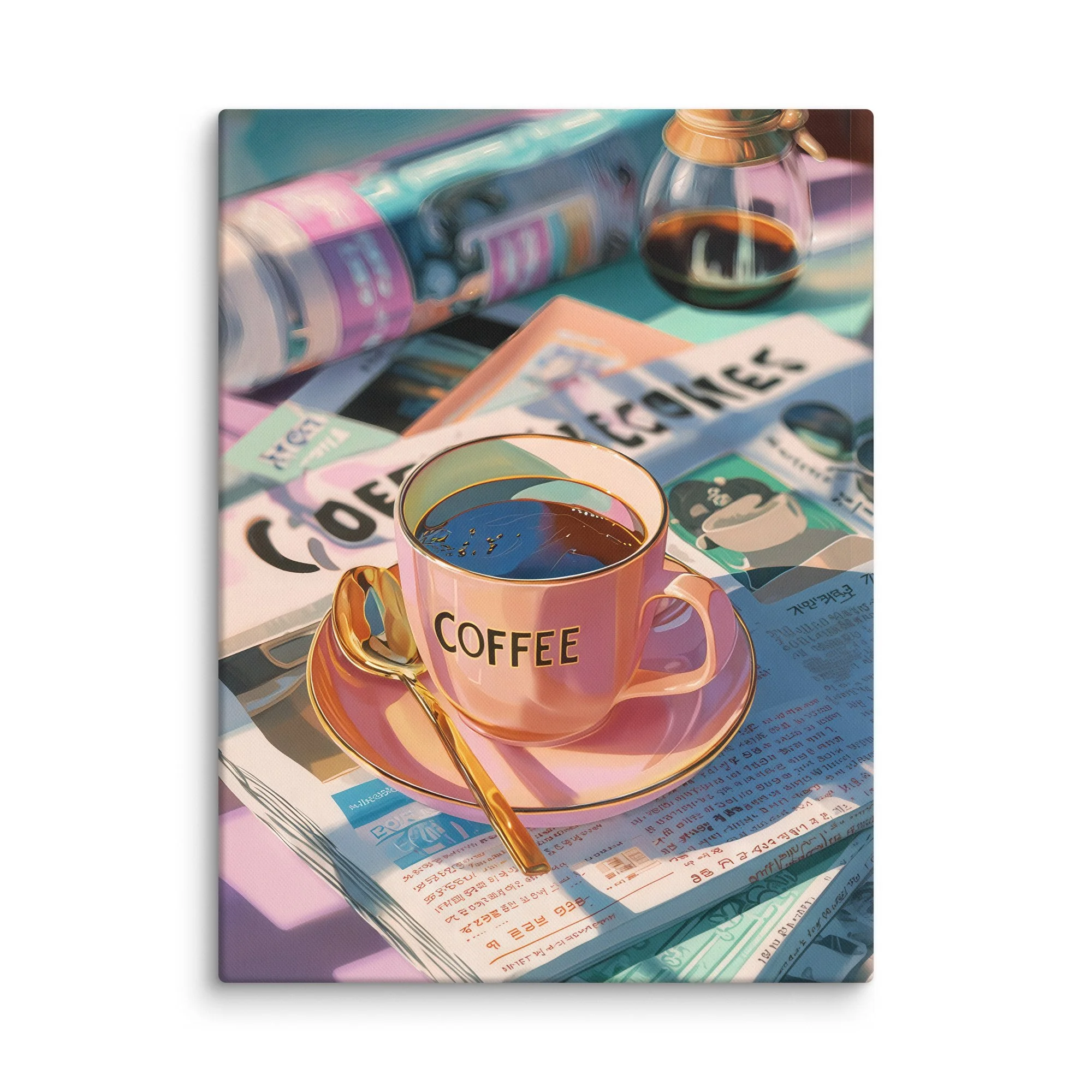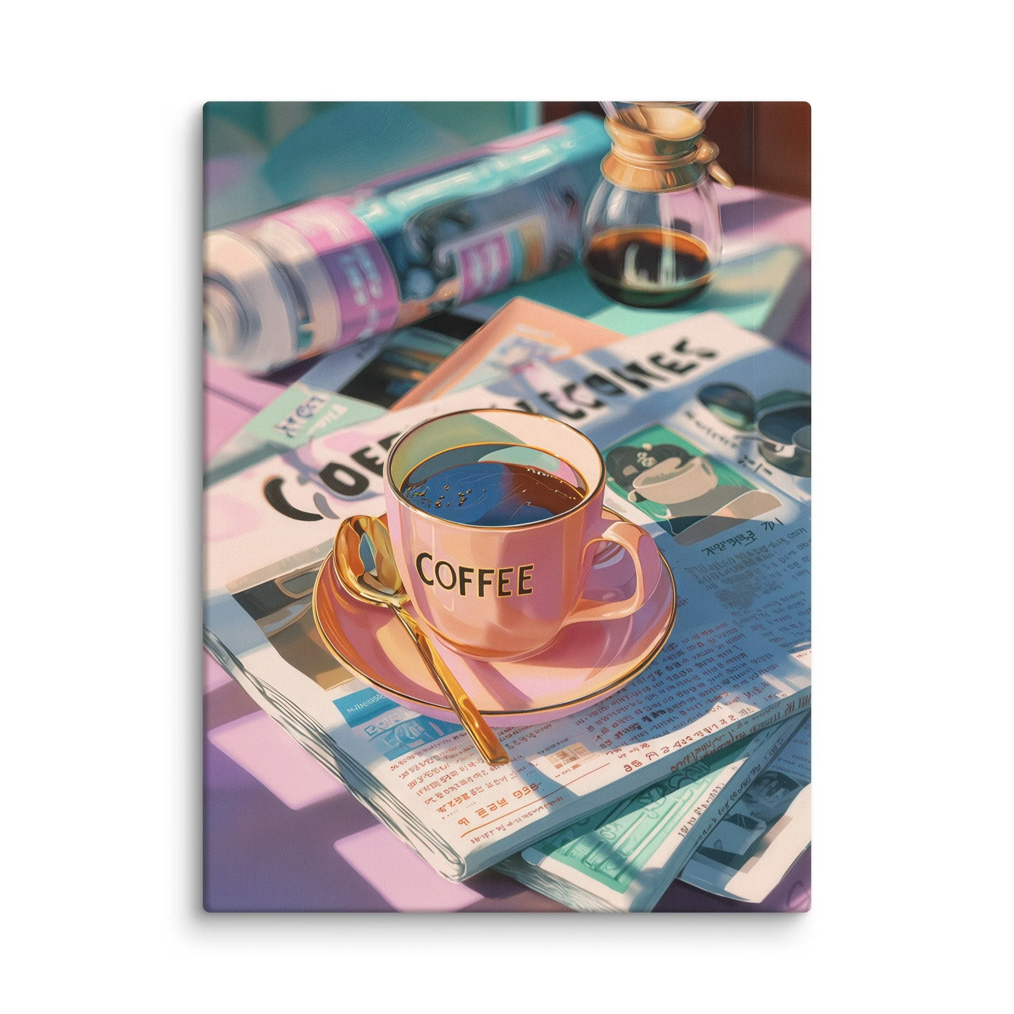 This still life captures the dreamy calm of a pastel morning café scene. A pink cup edged in gold gleams in the sunlight, steam curling above rich black coffee. Newspapers, a golden spoon, and a glass pour-over carafe rest nearby — painted in sun-washed hues of lavender, mint, and peach. Every reflection and shadow tells a story of slow mornings and creative awakenings.